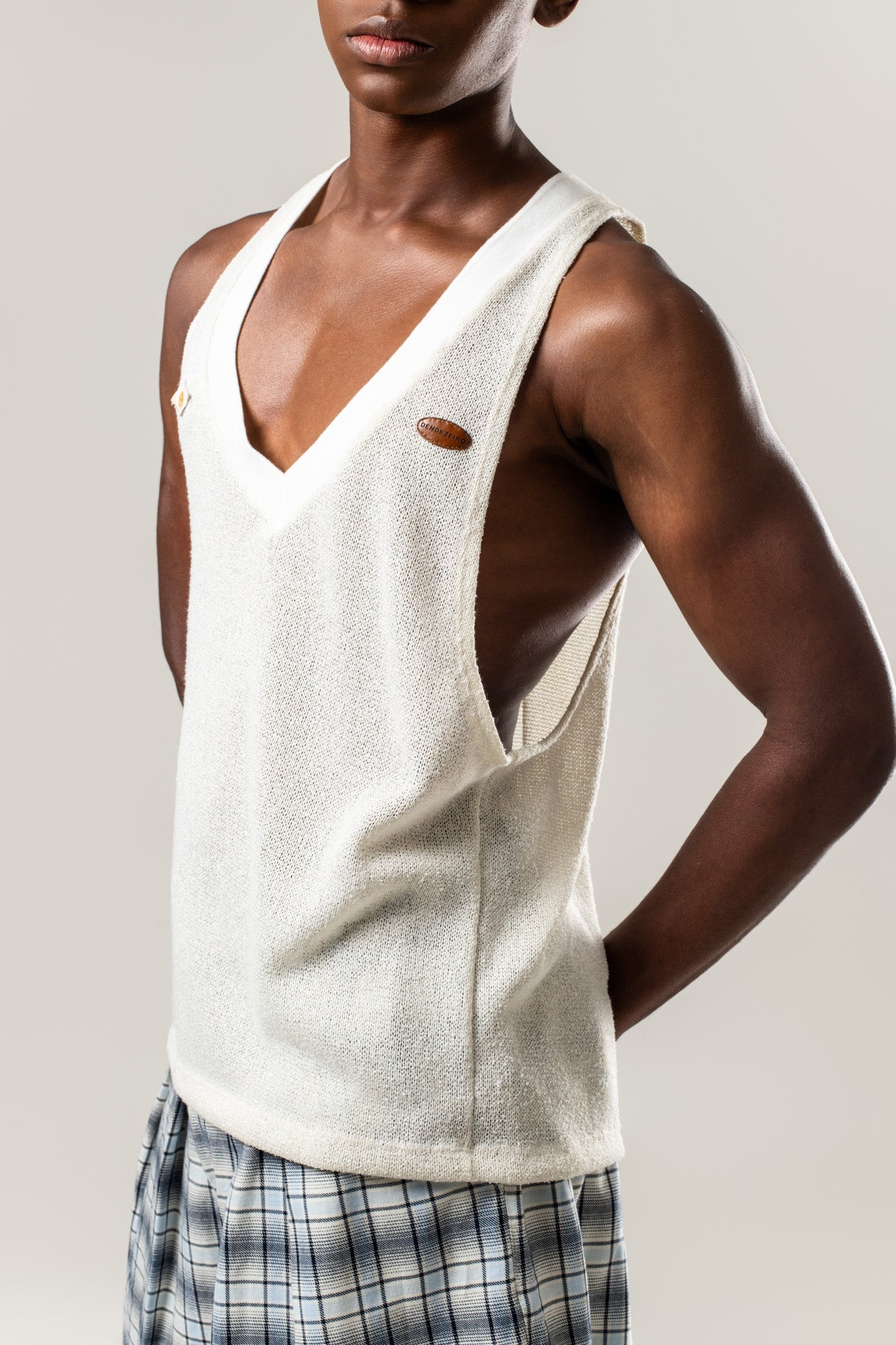 Regata cavada com gola V, confeccionada em tricô de máquina 100% poliéster na cor branca, com leve brilho. Bordado da parte interna da bandeira do Brasil, aplicado no lado esquerdo da peça. No lado direito, aplicação de bordado em couro na cor marrom com a inscrição “Dendezeiro”.
